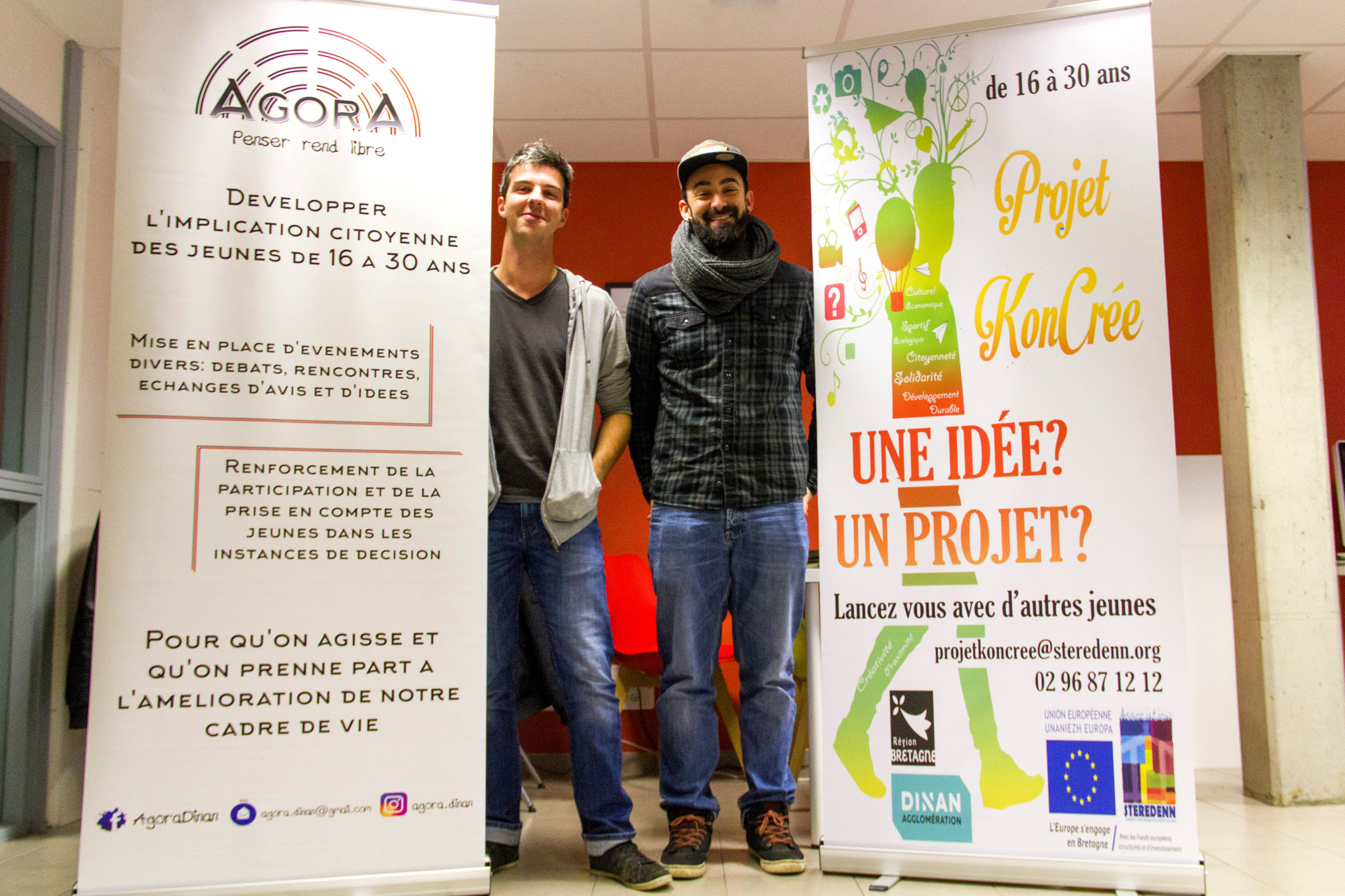 Alexandre et Jérôme, 4 mois à ProjetKonCrée. Depuis leur entrée en juin 2017 à ProjetKonCrée, ils ont crée l’association Agora ayant pour but de développer l'implication citoyenne des jeunes de 16 à 30 ans sur le territoire de Dinan Agglomération, pour agir ensemble et se faire entendre. Ils ont profité de leur temps à ProjetKonCrée pour créer et expérimenter :